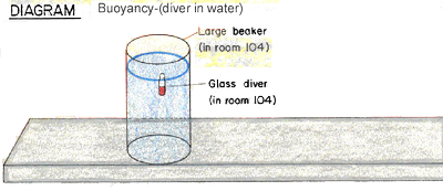 | Set up as shown. 1. Fill beaker with water - 3/4 full (room temperature). 2. Place diver in beaker. 3. Add hot or cold water to beaker to alter buoyancy of diver. Use of a water bulb (from laboratories) is optional. |