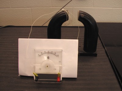 Info Current Produced in a Moving Coil by a Magnetic Field (Faraday's Law) Type of activity: demo Activity code: M-006a Courses PHY100 PHY205 SCI199 PHY132 Description: Wind up 1 - 3m of lamp cord into loops and connect as shown.1. Move loop of wires through the magnetic field. 2. Observe deflection of galvanometer. 3. Increase the number of turns for greater deflection. Apparatus Magnet (Large) Lamp Cord Galvanometer (projection)