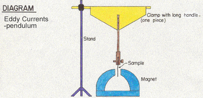 | 1. Use weighted stand. 2. Adjust height of clamp holder so plates swing freely through gap. Method: 1. Clamp hollow metal ring between holder. 2. Hold sample at 30 degree angle. 3. Release it and observe the magnet damp it's swing. 4. Now clamp a metal ring with slit between the holder. 5. Repeat part 2, but note the magnet has little effect. 6. Magnet shows no effect on plastic or wooden samples. |
