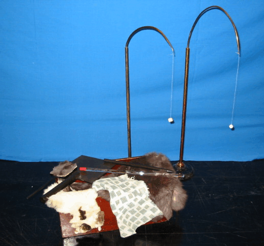 Info Electrostatics Type of activity: demo Activity code: E-027 Courses PHY100 PHY132 PHY205 Description: Demonstrates effects of charging by friction, contact and induction. Apparatus Pith ball with stand Glass Rod (solid) Polyester/Silk Rubber Rod Fur Pith ball stand Pith ball (pack) Saran Wrap