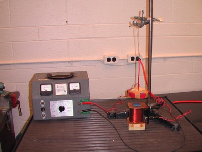 | 1. Connect as shown. 2. Turn power supply to 12 volts - 10 amps. 3. Adjust upper coil so it just touches lower coil. Note: Use the wooden slot platform to position the coil so that the top of the coil is near the top of the solid core. Method: 1. Turn on power supply. 2. Observe attractive force between the current carrying coils. 3. Reverse input lead on bottom coil. 4. Observe the repulsive force between them. |