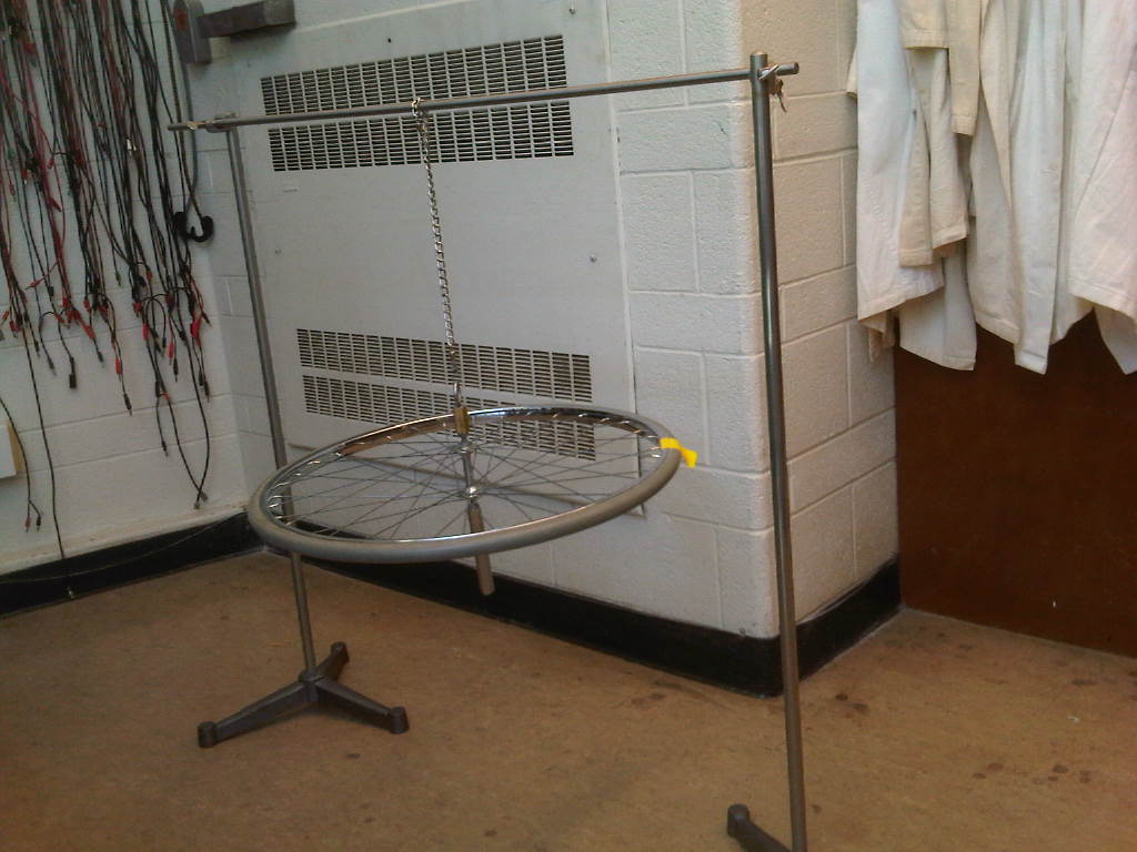 Hang the bike wheel on a bar held up by two retort stands (or use a longer chain to hang the wheel from the support beams in the lecture room ceiling, if available)