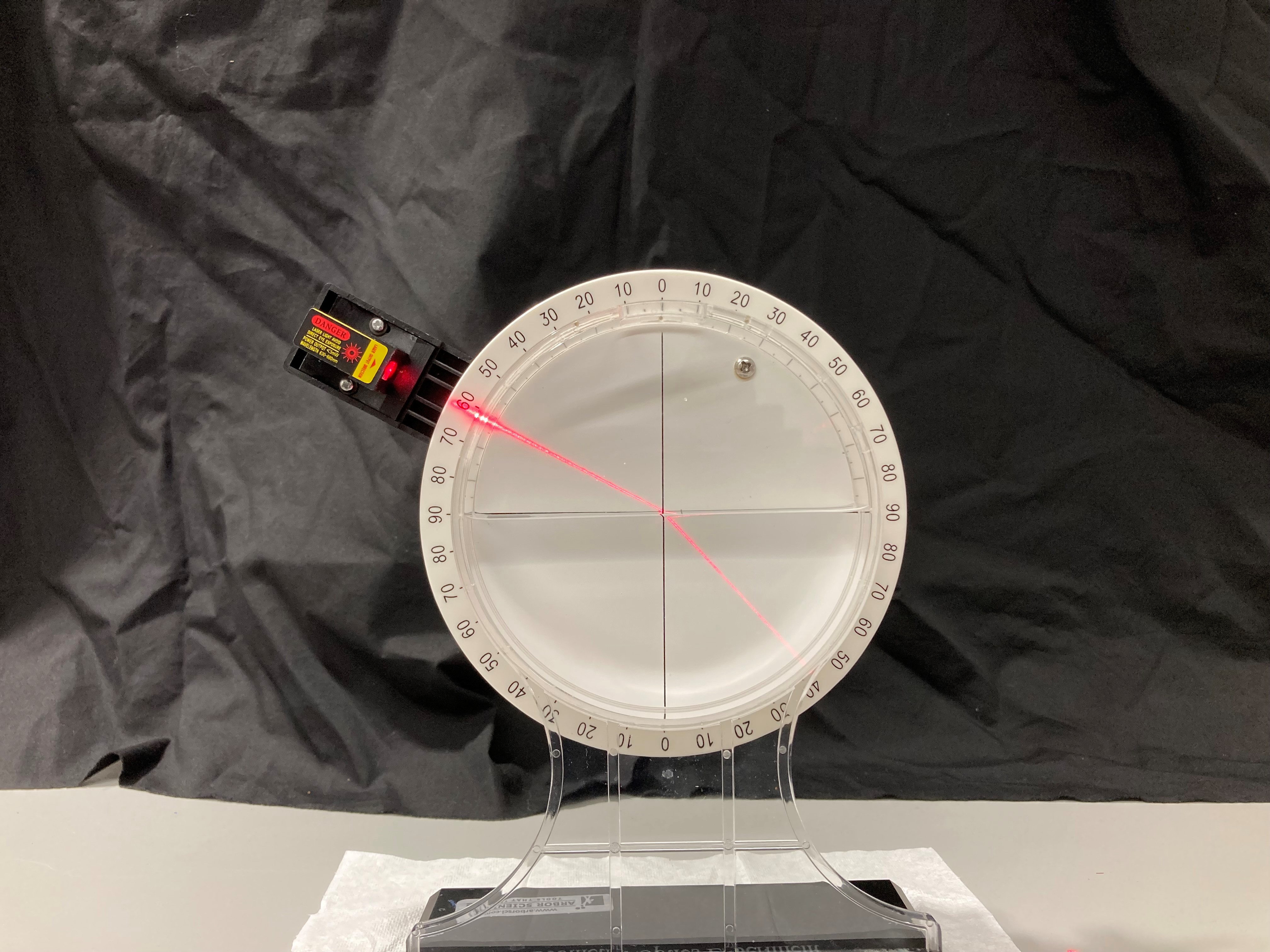 Info Refraction of a Laser Beam in water Type of activity: demo Activity code: 00000 Related items: Refraction of a Laser Beam Description: Observe how laser beam "bends" as it hits the surface of the water. Apparatus Arbor - Laser Refraction Tank