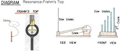 | Frahm's top: 1. Use overhead projector with focus set high. 2. Check string for wear and wind up evenly. 3. Hold top over the stage of projector and focus on reeds. 4. Use a slow steady pull to spin top. 5. Show that the top is not a gyro by holding it against a hard surface. 6. Vibrations will be heard. 7. Focus projector on individual reeds as top slows down. For vibrating saw blades: 1. Set up vibrating saw blade apparatus. 2. Crank. |